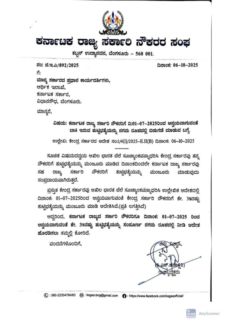ಆದ್ದರಿಂದ, ಕರ್ನಾಟಕ ರಾಜ್ಯದ ಸರ್ಕಾರಿ ನೌಕರರಿಗೂ ದಿನಾಂಕ: 01-07-2025 ರಿಂದ ಅನ್ವಯವಾಗುವಂತೆ ಶೇ. 3%ರಷ್ಟು ತುಟ್ಟಿಭತ್ಯೆಯನ್ನು ಸಂಪೂರ್ಣ ನಗದು ರೂಪದಲ್ಲಿ ನೀಡಿ ಆದೇಶ ಹೊರಡಿಸಲು ತಮ್ಮಲ್ಲಿ ಕೋರಿದೆ.
