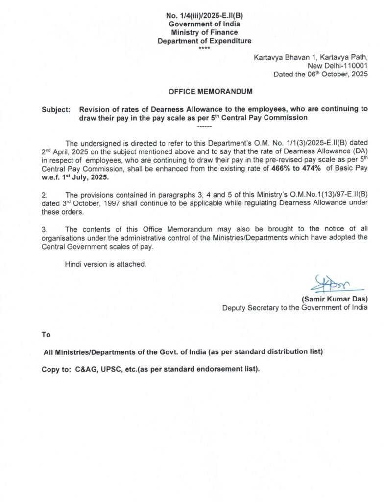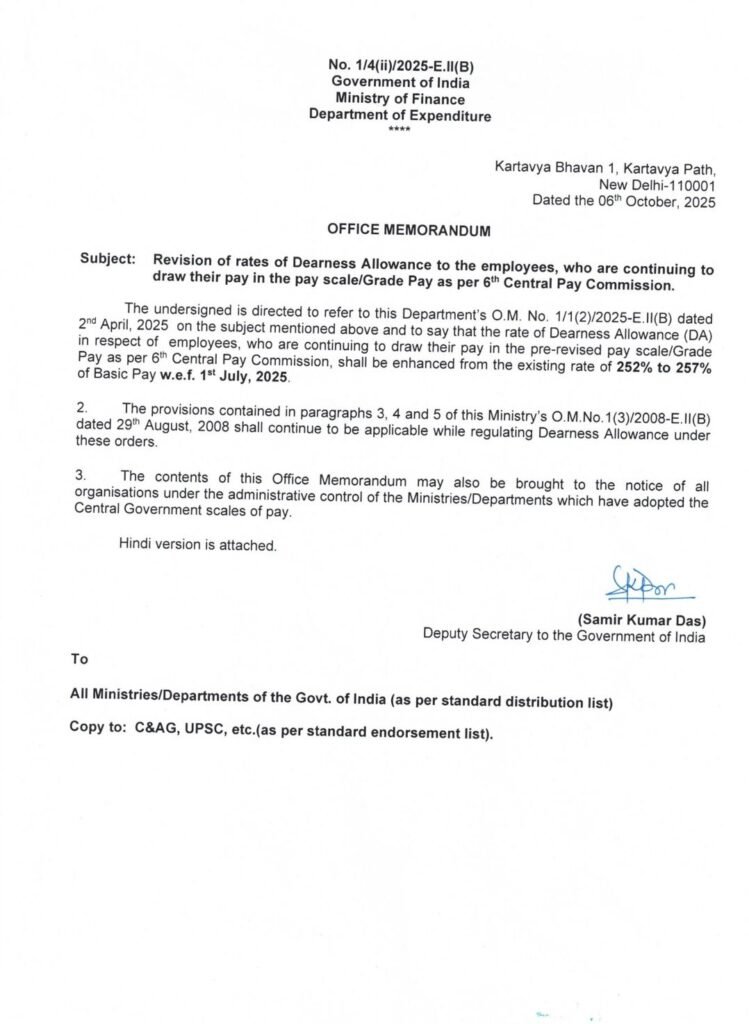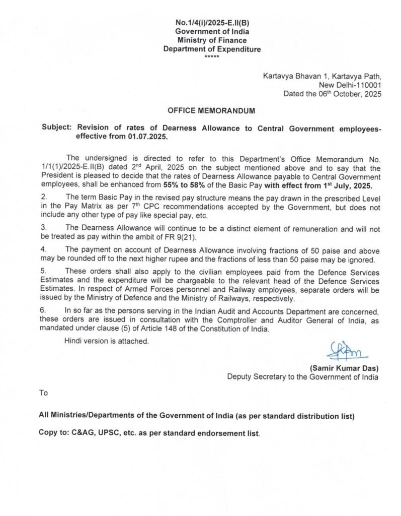 ಪ್ರಸ್ತುತ ಕೇಂದ್ರ ಸರ್ಕಾರವು ಅಖಿಲ ಭಾರತ ಬೆಲೆ ಸೂಚ್ಯಾಂಕವನ್ನಾಧರಿಸಿ ಉಲ್ಲೇಖಿತ ಆದೇಶದಲ್ಲಿ ದಿನಾಂಕ: 01-07-2025ರಿಂದ ಅನ್ವಯವಾಗುವಂತೆ ಕೇಂದ್ರ ಸರ್ಕಾರಿ ನೌಕರರಿಗೆ ಶೇ. 3%ರಷ್ಟು ತುಟ್ಟಿಭತ್ಯೆಯನ್ನು ಮಂಜೂರು ಮಾಡಿ ಆದೇಶಿಸಿದೆ.(ಪ್ರತಿ ಲಗತ್ತಿಸಿದೆ)