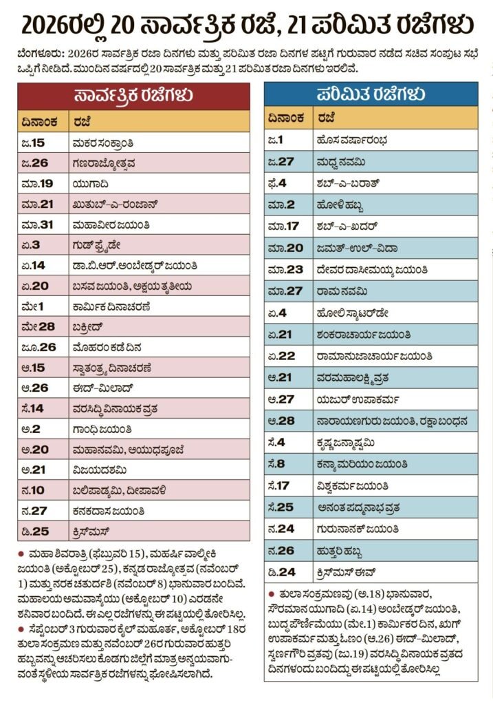 Government Holiday list- 20 general holidays, 21 limited holidays in 2026: ಸರ್ಕಾರವು 2026ನೇ ಸಾಲಿಗೆ ಮಂಜೂರು ಮಾಡಿರುವ ಸಾರ್ವತ್ರಿಕ ರಜಾ ದಿನಗಳ ಪಟ್ಟಿಯನ್ನು ಸಾರ್ವಜನಿಕ ಮಾಹಿತಿಗಾಗಿ ಈ ಕೆಳಕಂಡಂತೆ ಪ್ರಕಟಿಸಲಾಗಿದೆ.