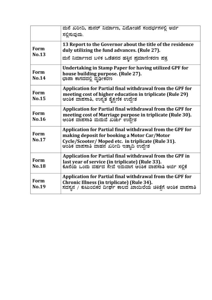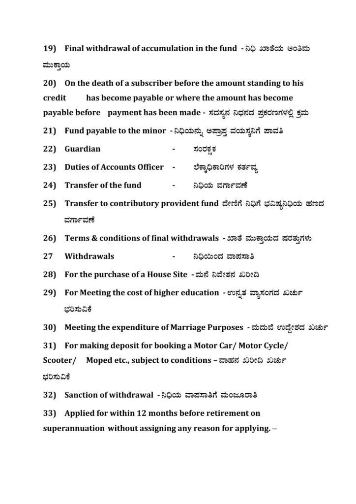 6.ನಿಮ್ಮ ಸಾ.ಭ.ನಿ. ಖಾತೆಯ ಅಂತಿಮ ಹಿಂತೆಗೆತದ ಅರ್ಜಿಯನ್ನು ಸರಿಯಾದ ಸಮಯಕ್ಕೆ ಇತ್ಯರ್ಥಗೊಳಿಸುವ ಸಲುವಾಗಿ ನಿವೃತ್ತಿಗೆ ಮೂರು ತಿಂಗಳುಗಳಷ್ಟು ಮುಂಚಿತವಾಗಿ ಹಣ ಸೆಳೆಯುವ ಮತ್ತು ಬಟವಾಡೆ ಅಧಿಕಾರಿಗಳ ಮೂಲಕ ಕಳುಹಿಸತಕ್ಕದ್ದು. ಅರ್ಜಿಯಲ್ಲಿ ದಯವಿಟ್ಟು ನಿಮ್ಮ ಮೊಬೈಲ್ ದೂರವಾಣಿ ಸಂಖ್ಯೆಯನ್ನು ನಮೂದಿಸಿ.