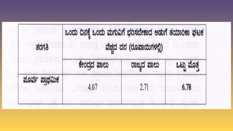 14)ಪೂರ್ವ ಪ್ರಾಥಮಿಕ ತರಗತಿಗಳಲ್ಲಿ ವ್ಯಾಸಂಗ ಮಾಡುತ್ತಿರುವ ವಿದ್ಯಾರ್ಥಿಗಳಿಗೆ ಮಧ್ಯಾಹ್ನದ ಬಿಸಿಯೂಟ ನೀಡುವ ಸಂಬಂಧ ಇತ್ತೀಚಿಗೆ ಸರ್ಕಾರದ ಆದೇಶ ಸಂಖ್ಯೆ: ಇಪಿ 120 ಎಂಎಂಎಸ್ 2024 ದಿನಾಂಕ: 20.08.2025ರಲ್ಲಿ ಪರಿಷ್ಕರಿಸಲಾಗಿರುವ ಅಡುಗೆ ತಯಾರಿಕಾ ವೆಚ್ಚದ ದರದಂತೆ ಒಂದು ದಿನಕಕ್ಕೆ ಒಬ್ಬ ವಿದ್ಯಾರ್ಥಿಗೆ ಕೆಳಕಂಡಂತೆ ಅಡುಗೆ ತಯಾರಿಕಾ ವೆಚ್ಚವನ್ನು ರಾಜ್ಯದ ಎಲ್ಲಾ ಜಿಲ್ಲಾ ಪಂಚಾಯತ್ ಮುಖ್ಯ ಕಾರ್ಯನಿರ್ವಾಹಕ ಅಧಿಕಾರಿಗಳು ಭರಿಸತಕ್ಕದ್ದು.