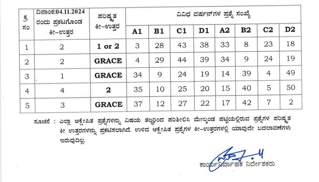 ಅದರಂತೆ, ಅಭ್ಯರ್ಥಿಗಳಿಂದ ಸ್ವೀಕೃತಗೊಂಡ ಆಕ್ಷೇಪಣೆಗಳನ್ನು ವಿಷಯ ತಜ್ಞರು ಪರಿಶೀಲಿಸಿದ ನಂತರ ಮೇಲ್ಕಂಡ ಪತ್ರಿಕೆಗೆ ಸಂಬಂಧಿಸಿದಂತೆ ಅಂತಿಮವಾಗಿ ಪರಿಷ್ಕೃತಗೊಂಡಿರುವ ಕೀ ಉತ್ತರ ಈ ಕೆಳಕಂಡಂತಿದೆ.