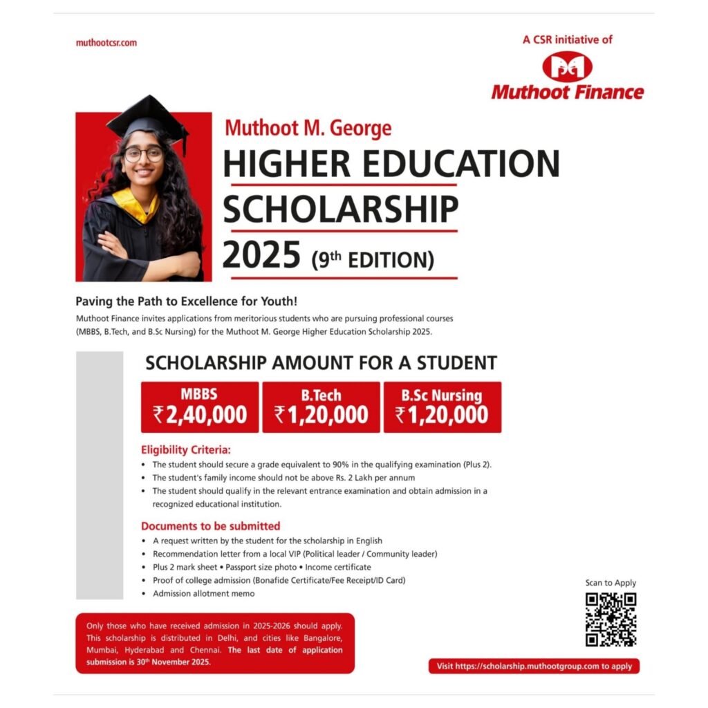 ಉನ್ನತ ವಿದ್ಯಾಭ್ಯಾಸವನ್ನು ಮುಂದುವರಿಸಲು ಆರ್ಥಿಕ ತೊಂದರೆ ಎದುರಿಸುತ್ತಿರುವ ವಿದ್ಯಾರ್ಥಿಗಳಿಗೆ ಮುತ್ತೂಟ್ ಫೈನಾನ್ಸ್ ಕಂಪನಿ ಪ್ರತಿ ವರ್ಷ “Muthoot M. George Higher Education Scholarship” ಮೂಲಕ ಮಹತ್ವದ ನೆರವು ನೀಡುತ್ತಿದೆ. 2025-26 ಶೈಕ್ಷಣಿಕ ವರ್ಷದ ವಿದ್ಯಾರ್ಥಿವೇತನಕ್ಕೆ ಅರ್ಜಿ ಪ್ರಕ್ರಿಯೆ ಈಗ ಆರಂಭವಾಗಿದೆ. MBBS, B.Tech ಮತ್ತು B.Sc Nursing ಕೋರ್ಸ್ಗಳಿಗೆ ಸೇರಿರುವ ಪ್ರತಿಭಾವಂತ ವಿದ್ಯಾರ್ಥಿಗಳಿಗೆ ಈ ಯೋಜನೆ ಸೂಕ್ತ ಅವಕಾಶ.