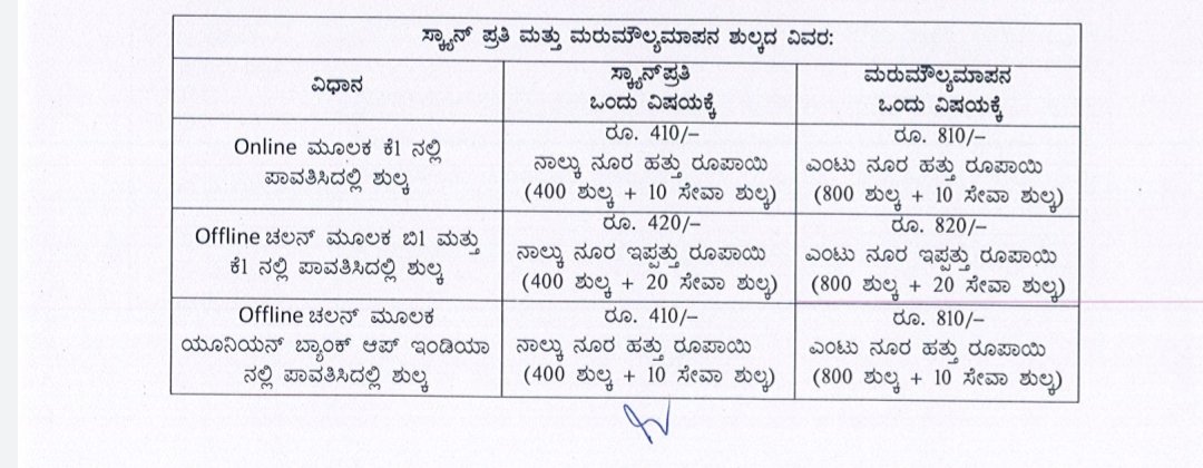 ಸ್ಕ್ಯಾನ್‌ ಪ್ರತಿ ಹಾಗೂ ಮರುಮೌಲ್ಯಮಾಪನಕ್ಕಾಗಿ ಭೌತಿಕವಾಗಿ ಅರ್ಜಿಗಳನ್ನು ಸ್ವೀಕರಿಸುವುದನ್ನು ರದ್ದುಪಡಿಸಲಾಗಿದೆ. ಮರುಎಣಿಕೆ ಅಥವಾ ಮರುಮೌಲ್ಯಮಾಪನ ಸೇವೆಯನ್ನು ಪಡೆಯಬೇಕಾದಲ್ಲಿ ಸ್ಕ್ಯಾನ್‌ ಪ್ರತಿಯನ್ನು ಕಡ್ಡಾಯವಾಗಿ ಪಡೆಯಬೇಕಾಗಿರುತ್ತದೆ. ಸ್ಕ್ಯಾನ್ ಪ್ರತಿ ಮತ್ತು ಮರುಮೌಲ್ಯಮಾಪನಕ್ಕಾಗಿ ಆನ್‌ಲೈನ್‌ನಲ್ಲಿ ಅರ್ಜಿ ಸಲ್ಲಿಸಲು ಮಂಡಳಿಯ ಜಾಲತಾಣದ ವಿಳಾಸ  website address):- https://kseab.karnataka.gov.in ರಲ್ಲಿ ಮಾಹಿತಿ ಲಭ್ಯವಿದ್ದು,ಸದರಿ ಜಾಲತಾಣದಲ್ಲಿ ಆನ್‌ಲೈನ್‌ನಲ್ಲಿ ನಿಗದಿತ ಶುಲ್ಕವನ್ನು ಡೆಬಿಟ್ ಕಾರ್ಡ್/ಕ್ರೆಡಿಟ್ ಕಾರ್ಡ್ /ಆನ್‌ಲೈನ್ ಬ್ಯಾಂಕಿಂಗ್ (ಕರ್ನಾಟಕ-ಒನ್ ಪೋರ್ಟಲ್) ಮೂಲಕ ಪಾವತಿಸಿ ಅರ್ಜಿ ಸಲ್ಲಿಸಬಹುದಾಗಿದೆ. ಡೆಬಿಟ್ ಕಾರ್ಡ್/ಕ್ರೆಡಿಟ್ ಕಾರ್ಡ್/ಆನ್‌ಲೈನ್ ಬ್ಯಾಂಕಿಂಗ್ ಸೌಲಭ್ಯವಿಲ್ಲದವರು ಆನ್‌ಲೈನ್‌ನಲ್ಲಿ ಅರ್ಜಿ ಸಲ್ಲಿಸಿದ ನಂತರ ಚಲನ್ ಡೌನ್‌ಲೋಡ್ ಮಾಡಿಕೊಂಡು ಯೂನಿಯನ್ ಬ್ಯಾಂಕ್ ಆಪ್ ಇಂಡಿಯಾ/ಬೆಂಗಳೂರು-ಒನ್/ಕರ್ನಾಟಕ-ಒನ್ ಕೇಂದ್ರದಲ್ಲಿ ಶುಲ್ಕವನ್ನು ಪಾವತಿಸಬಹುದಾಗಿದೆ. ಸ್ಕ್ಯಾನ್ ಪ್ರತಿ / ಮರುಮೌಲ್ಯಮಾಪನಕ್ಕಾಗಿ ಮೇಲ್ಕಂಡಂತೆ ಅರ್ಜಿ ಸಲ್ಲಿಸಿದ ನಂತರ ಅರ್ಜಿ ಸ್ವೀಕಾರವಾದ ಬಗ್ಗೆ ನೋಂದಾಯಿಸಿದ ಮೊಬೈಲ್ ಸಂಖ್ಯೆಗೆ ಎಸ್‌ಎಂಎಸ್ ಮುಖಾಂತರ ಮಾಹಿತಿ ರವಾನೆಯಾಗುತ್ತದೆ.