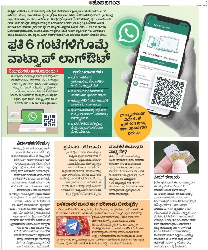 ಇನ್ನು ವಾಟ್ಸಾಪ್ ಖಾತೆ ಕಡ್ಡಾಯ ಹಸಿ ಸೆಕ್ರಿಯ ಸಿಮ್ ಕಾರ್ಡ್ ಗೆ ಲಿಂಕ್ ಆನಬೇಕು. ಸಿಮ್ ಅಂತವೇಟ್ ಮಾಡಿದರೆ 6 ಗಂಟೆ ತೆಗೆದರೆ, ಅಗುವ ನಿಯಮ ಜಾರಿಗೆ ಬರಲಿದೆ. ವೆಟ್ ಅಪ್ರತ್ತಿಯ ವಾಟ್ಲಾವ್ ಪ್ರತಿ 6 ಕಂಟೆಗಳಿಗೊಮ್ಮೆ ಸ್ವಯಂಚಾಲಿತವಾಗಿ ಕಾಗೌಟ್ ಆಗಲಿದ್ದು ಬಳಕೆದಾರರು ಪುನಃ ಕ್ಯೂಆರ್ಕೋಡ್ ಮೂಲಕ ಮರು ದೃಢೀಕರಿಸಬೇಕು.
